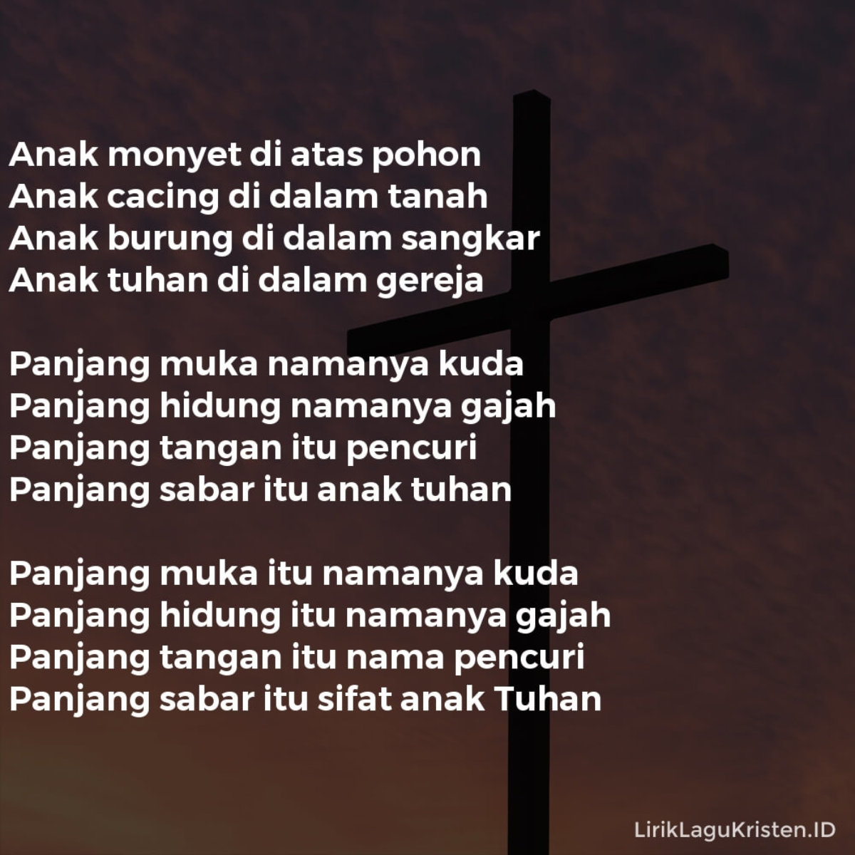 Di dalam dunia ada dua jalan. ANAK MONYET DI ATAS POHON ANAK CACING DI DALAM TANAH ANAK BURUNG DI DALAM SANGKAR ANAK TUHAN DI DALAM GEREJA PANJANG MUKA NAMANYA KUDA. D A Panjang muka namanya kuda A D Panjang hidung namanya gajah D G.